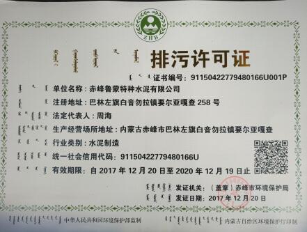 2018年2月,魯蒙水泥成功獲得排污許可證,成為赤峰市首批取得排污許可證的水泥企業(yè)。