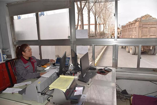 過磅員董梅在為盤運(yùn)車輛“量體重”