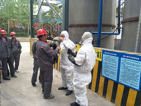 4月24日,魯中水泥安環(huán)部在旋窯車間氨水罐區(qū)組織“氨水泄漏事故”應急演練。旋窯車間主任袁雷及旋窯車間氨水罐區(qū)員工參加。演練開始前,安環(huán)部專員李霄對參加演練人員詳細講解了氨水的危害特性、緊急處置方法等,強調演練過程中需注意事項和演練程序。演練開始,操作工發(fā)現氨水罐區(qū)出現泄漏情況,現場查看后立即使用對講機上報,操作人員因吸入過多氨氣導致呼吸困難,無法撤離氨水區(qū)域。搶險救援組組長袁雷應急而動,帶領兩名救援人員身著防護服、呼吸器、手套等器材,對現場被困人員進行救援,并實施緊急救治。人員救出后,保障組成員帶領水車,使用水槍對現場泄漏氨水進行噴灑,稀釋氨水濃度,降低危害。