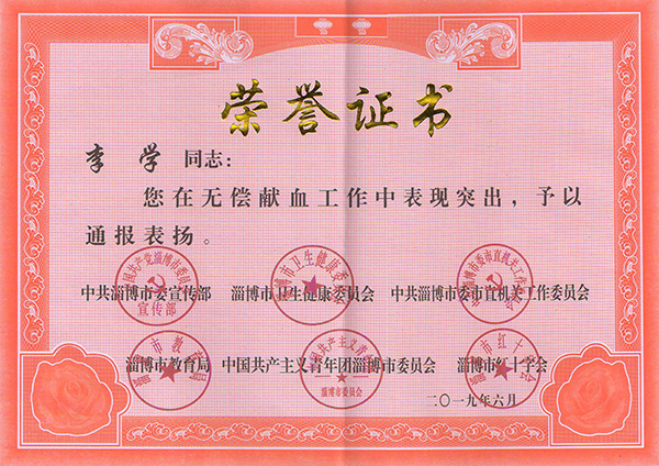 祝賀集團公司和李學(xué)董事長榮獲市無償獻(xiàn)血榮譽