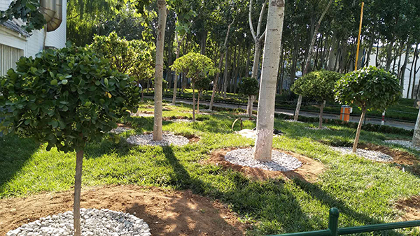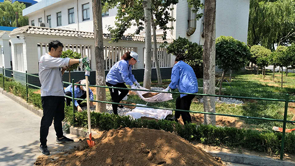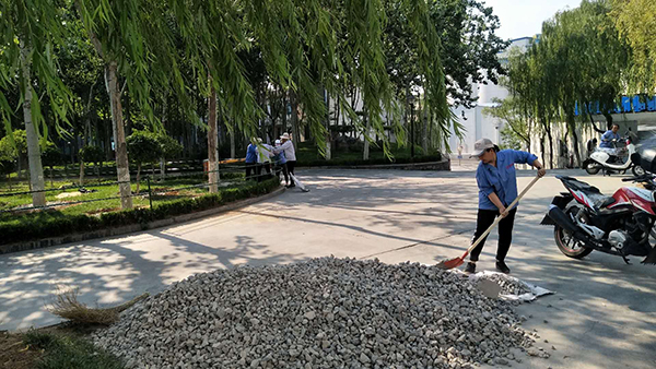 隨著高溫酷暑季節(jié)到來,為保持綠化區(qū)樹穴澆灌水不流失,6月23日,物資部經(jīng)理張娟聯(lián)系供料車間運(yùn)來石子和土,物資部眾姐妹紛紛拿起工具,頂著烈日行動起來,大家分工合作,卸車、運(yùn)輸,為每個(gè)樹穴填土、鋪石子,歷經(jīng)一天的時(shí)間,為綠化帶的樹木穿上了一層美麗的嫁衣。