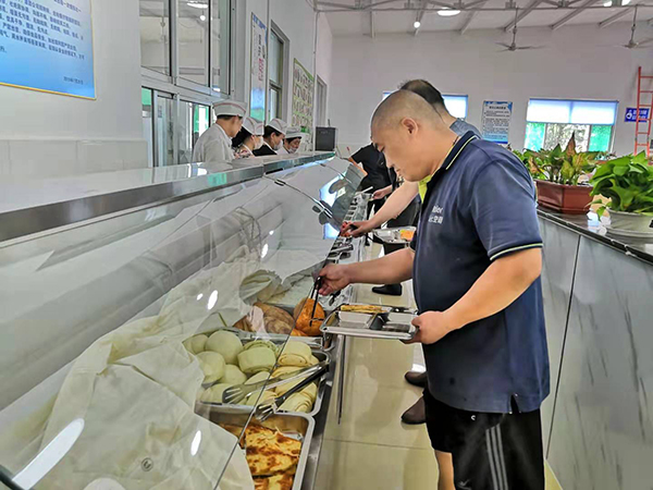 重裝后的食堂桌椅整齊、環(huán)境干凈整潔、布置舒適溫馨、菜色新鮮、品類豐富,以自助餐和半自助餐等形式就餐,不僅滿足了生活區(qū)職工和熱電廠、供料等單位員工的就餐需求,同時也為各類送貨司機和施工人員提供了就餐便利,用實際行動踐行了致良知思想,真正做到了“為員工謀福祉”。
