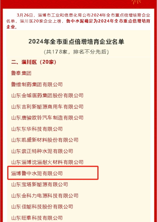 【榮譽】魯中水泥入選淄博市重點倍增培育企業(yè)
