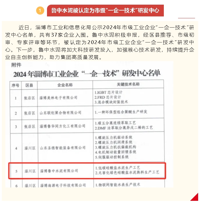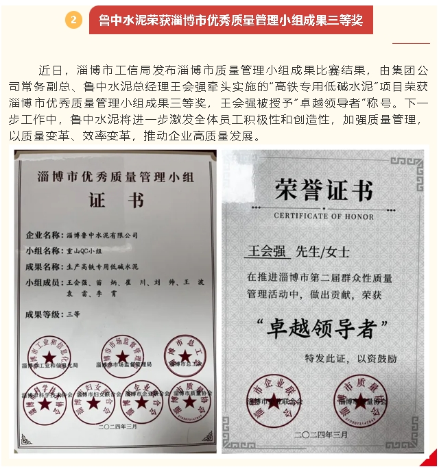 【榮譽】魯中水泥被認(rèn)定為市級“一企一技術(shù)”研發(fā)中心、淄博市優(yōu)秀質(zhì)量管理小組成果三等獎