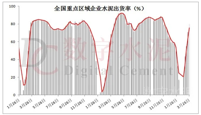 三月下旬,隨著天氣好轉(zhuǎn),建筑工程和攪拌站開工率明顯提升,水泥需求也得以迅速恢復(fù)。據(jù)數(shù)字水泥網(wǎng)監(jiān)測出貨率數(shù)據(jù)顯示,本周全國重點(diǎn)區(qū)域水泥企業(yè)平均出貨率為81%,環(huán)比增加10個百分點(diǎn)。分區(qū)域看,華東、華南地區(qū)需求恢復(fù)較好,企業(yè)出貨率均達(dá)到九成以上或正常水平,個別區(qū)域?qū)崿F(xiàn)銷大于產(chǎn);華北、華中和西南地區(qū)下游需求保持穩(wěn)步回升,出貨率分別為76%、84%和85%,環(huán)比前期增加5%-10%;東北和西北地區(qū)受制于天氣因素,下游需求整體恢復(fù)略顯靠后,本周平均出貨率為40%和64%。