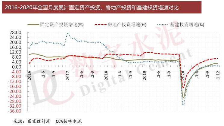 年初以來,面對新冠肺炎疫情的巨大沖擊和復雜的國內(nèi)外社會環(huán)境。為抑制經(jīng)濟下行,我國繼續(xù)加強宏觀政策逆周期調(diào)節(jié)力度,加快“六保”“六穩(wěn)”政策落地,落實各項重大改革舉措,充分發(fā)揮中國超大規(guī)模市場優(yōu)勢和內(nèi)需潛力,構(gòu)建國內(nèi)循環(huán)為主、國內(nèi)國際雙循環(huán)相互促進的新發(fā)展格局,多措并舉鞏固經(jīng)濟復蘇向好態(tài)勢。積極的財政政策和穩(wěn)健的貨幣政策持續(xù)顯效發(fā)力,克服了疫情和汛情的不利影響,分階段、有節(jié)奏、有針對性地推出一系列政策舉措,經(jīng)濟快速回暖。尤其是水泥相關(guān)的固定資產(chǎn)投資、房地產(chǎn)投資、基建投資指標快速回升明顯,使得2020年全年我國水泥需求總量未受影響,繼續(xù)保持在23~24億噸的高位平臺期。