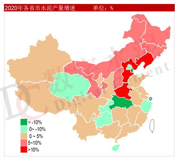 分區(qū)域看,2020年全國六大區(qū)域市場中,北方區(qū)域累計水泥產(chǎn)量同比增速持續(xù)提升且快于南部區(qū)域。其中,華北和東北保持高位增長,除京津地區(qū)外各省份同比均有明顯增長,河北和遼寧增速達到兩位數(shù)以上;西北地區(qū)總體呈現(xiàn)同比小幅增長,除青海需求大幅下降外,其他省份同比均實現(xiàn)不同幅度增長。南方區(qū)域中,華東和中南水泥產(chǎn)量年末實現(xiàn)由負轉(zhuǎn)正,但長三角地區(qū)較去年同期仍有小幅下降;西南地區(qū)累計水泥產(chǎn)量同比仍略有下降,降幅持續(xù)收窄至不足1%。