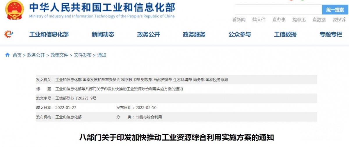 【轉(zhuǎn)載】工信部等八部門印發(fā)《關(guān)于加快推動工業(yè)資源綜合利用的實(shí)施方案》