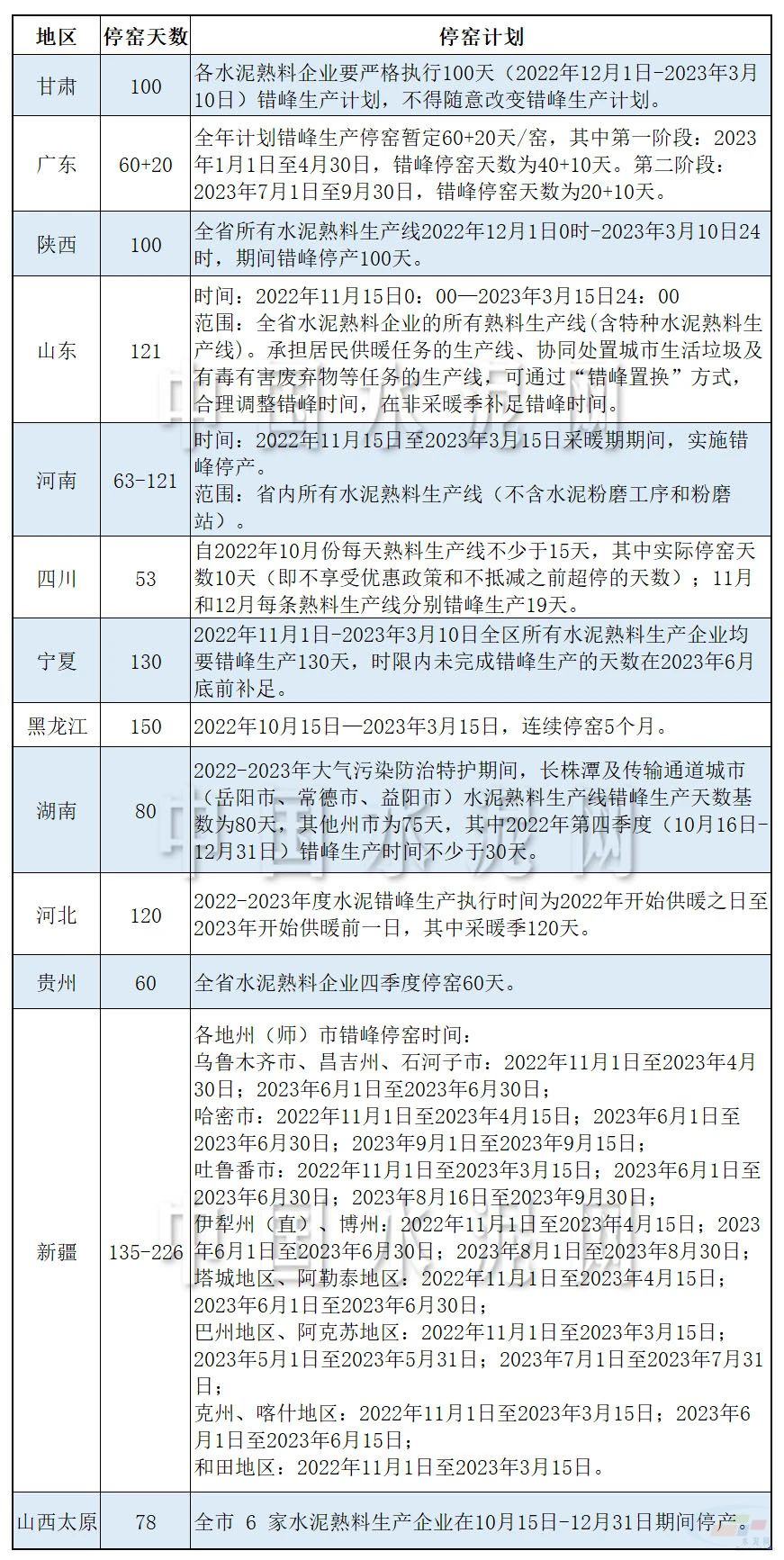 據(jù)中國(guó)水泥網(wǎng)不完全統(tǒng)計(jì),廣東、甘肅、河北、陜西、山東、河南、四川、寧夏等十余地區(qū)發(fā)布了2022-2023秋冬季錯(cuò)峰停窯計(jì)劃如下: