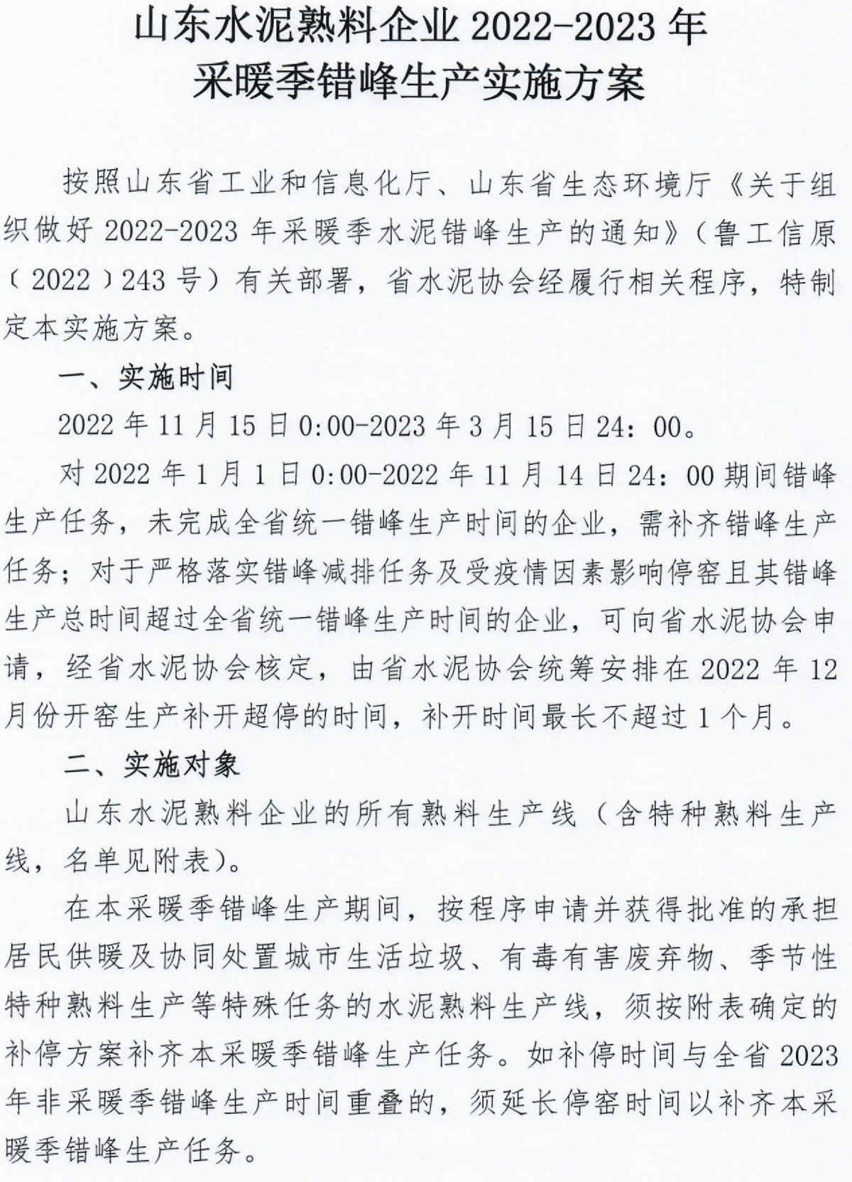 11月8日,山東省工業(yè)和信息化廳,生態(tài)環(huán)境廳發(fā)布《山東省工業(yè)和信息化廳山東省生態(tài)環(huán)境廳關(guān)于組織做好2022-2023年采暖季水泥常態(tài)化錯(cuò)峰生產(chǎn)的通知》(魯工信原[2022]243號(hào)),《通知》中要求全省水泥熟料企業(yè)的所有熟料生產(chǎn)線(含特種水泥熟料生產(chǎn)線)在2022年11月15日0:00-2023年3月15日24:00進(jìn)行錯(cuò)峰生產(chǎn)。