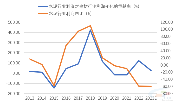 2022年,水泥行業(yè)營業(yè)收入占建材行業(yè)的14%,利潤總額占建材行業(yè)的14%,均低于總資產(chǎn)占比(20%),行業(yè)銷售利潤率也已經(jīng)低于建材行業(yè)平均水平。2023年,水泥行業(yè)景氣度進(jìn)一步下滑,上半年利潤總額大幅下滑60%,是拖累今年建材工業(yè)增加值增速明顯放緩的重要原因。作為建材行業(yè)第二大子行業(yè),水泥制造業(yè)的經(jīng)營穩(wěn)定對建材行業(yè)的穩(wěn)增長至關(guān)重要。從歷史數(shù)據(jù)看,水泥行業(yè)利潤的大幅波動,都會造成建材行業(yè)的利潤大幅度波動(圖2)。因此,筆者認(rèn)為,建材行業(yè)要實(shí)現(xiàn)穩(wěn)增長目標(biāo),水泥行業(yè)必須打頭陣,只有水泥行業(yè)穩(wěn)住并實(shí)現(xiàn)一定的增長,建材工業(yè)實(shí)現(xiàn)2023-2024年的增加值增速目標(biāo)才有希望。