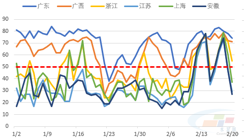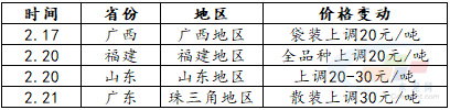 春節(jié)期間,多數(shù)地區(qū)放假停工,水泥企業(yè)進行錯峰或檢修停產(chǎn),供應出現(xiàn)下滑,庫存保持相對低位運行,節(jié)后庫存壓力下降,企業(yè)漲價意愿強烈,華東、華南部分水泥大省開始零星調(diào)漲水泥價格。