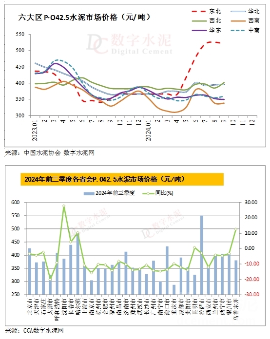 分區(qū)域來(lái)看,前三季度東北水泥價(jià)格獨(dú)占鰲頭,均價(jià)達(dá)437元/噸,遠(yuǎn)超全國(guó)均價(jià)64元,同比增長(zhǎng)12.8%,施工旺季更是飆升至522元/噸,較去年同期高出175元/噸。此成就得益于區(qū)內(nèi)企業(yè)嚴(yán)格執(zhí)行錯(cuò)峰生產(chǎn),限產(chǎn)力度大,庫(kù)存低位,供需關(guān)系持續(xù)優(yōu)化。