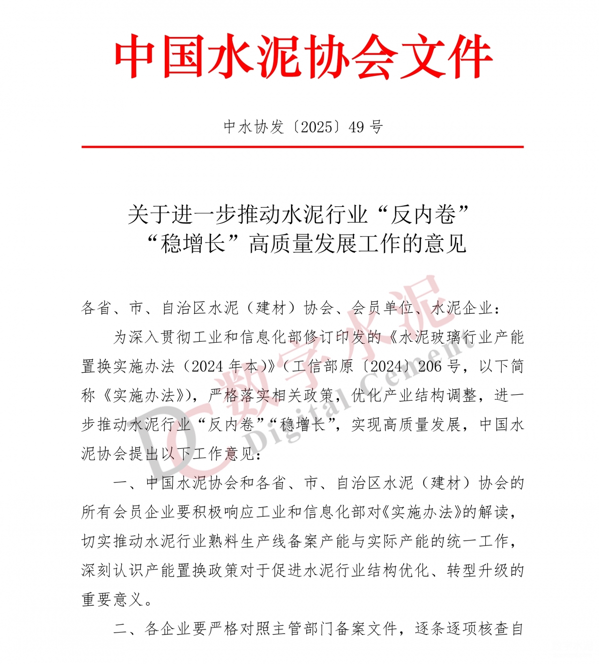 【轉(zhuǎn)載】中國(guó)水泥協(xié)會(huì):關(guān)于進(jìn)一步推動(dòng)水泥行業(yè)“反內(nèi)卷”“穩(wěn)增長(zhǎng)”高質(zhì)量發(fā)展工作的意見(jiàn)