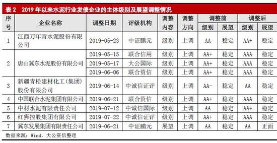 2019年以來(lái),水泥行業(yè)內(nèi)發(fā)債企業(yè)的級(jí)別遷移均為主體級(jí)別或展望上調(diào),涉及主體7家。具體來(lái)看,級(jí)別上調(diào)的企業(yè)6家,除1家由AA-調(diào)整為AA外,其余5家調(diào)整后級(jí)別均在AA+以上;展望上調(diào)的企業(yè)1家,評(píng)級(jí)展望由穩(wěn)定調(diào)整為正面。級(jí)別或展望上調(diào)的理由主要包括區(qū)域性政策利好于行業(yè)發(fā)展,收并購(gòu)促進(jìn)資源整合,企業(yè)經(jīng)營(yíng)業(yè)績(jī)顯著提升,資金流動(dòng)性顯著改善等。
