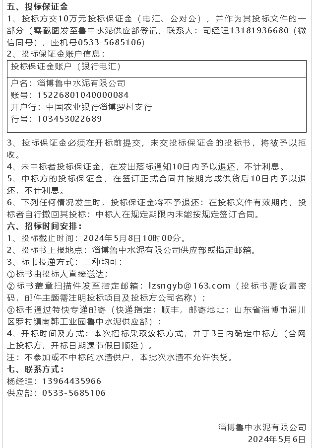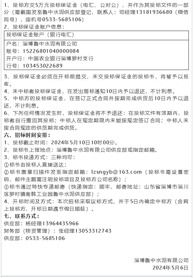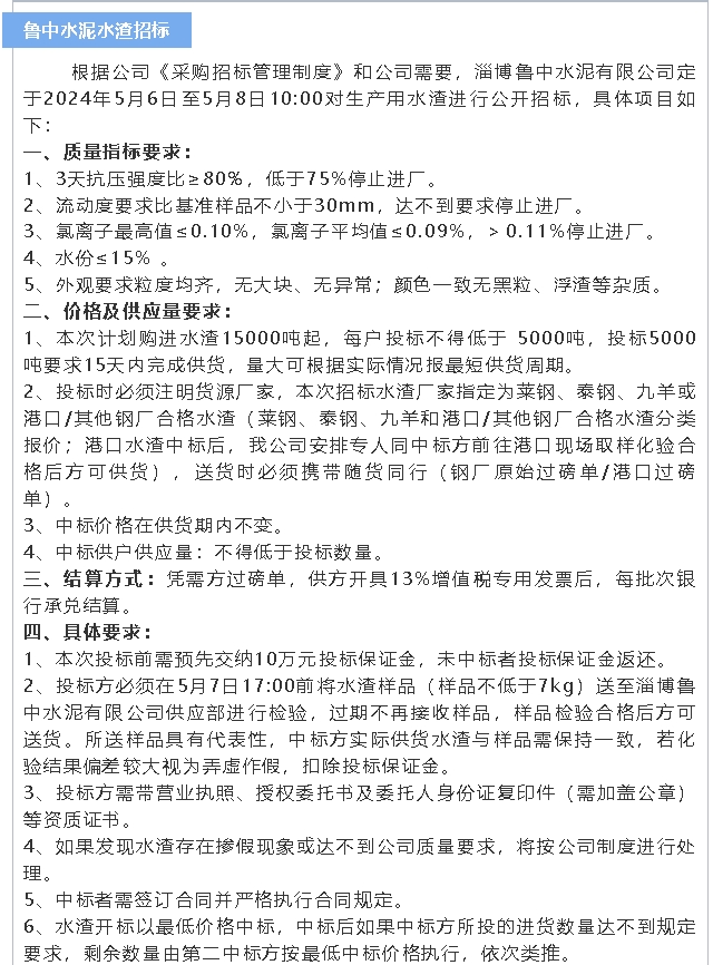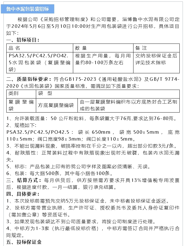【招標(biāo)公告】魯中水泥包裝袋、水渣招標(biāo)
