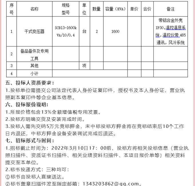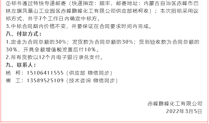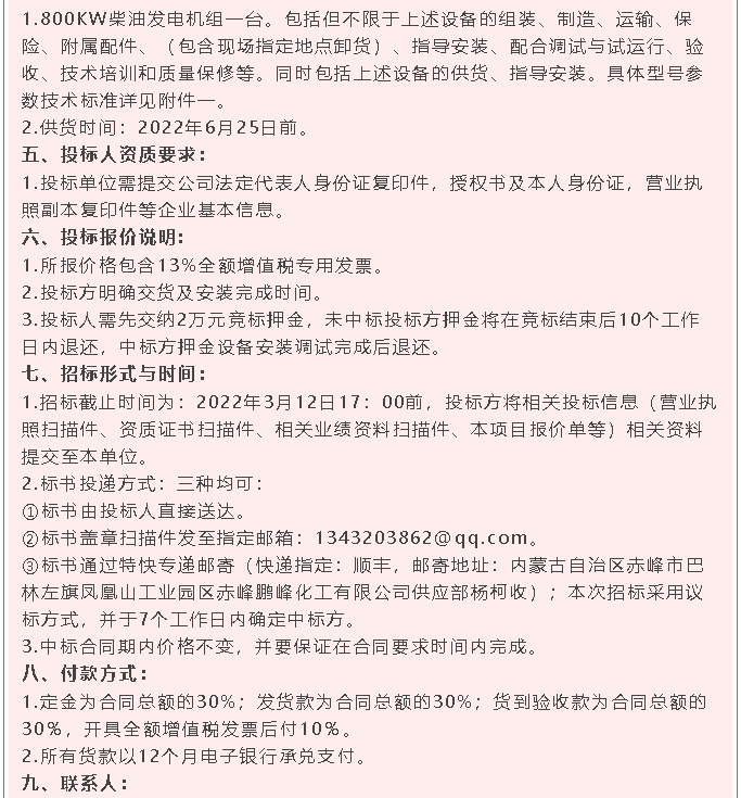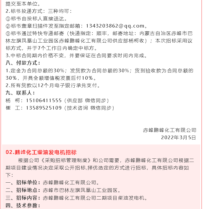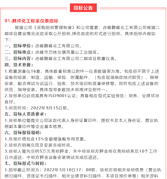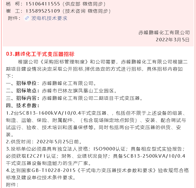 【招標(biāo)公告】鵬峰化工稱重儀表、柴油發(fā)電機(jī)、干式變壓器招標(biāo)