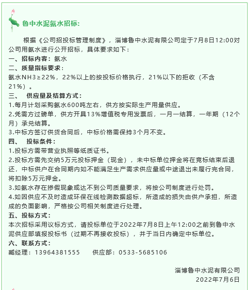 【招標(biāo)公告】魯中水泥氨水、建筑用中砂招標(biāo)