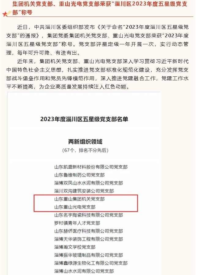 【黨建】集團機關(guān)黨支部、重山光電黨支部榮獲“淄川區(qū)2023年度五星級黨支部”稱號